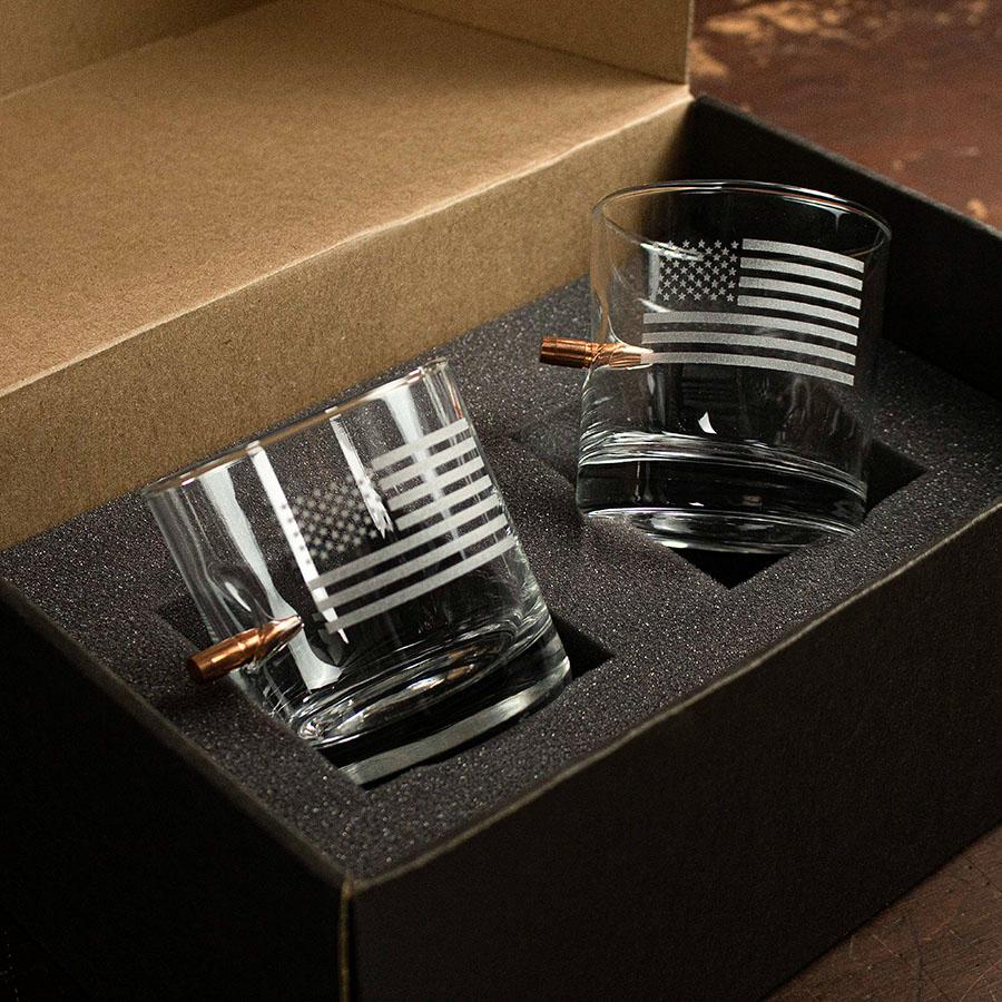 This 11oz whiskey glass is hand-embedded with a real, lead-free .308 caliber bullet and laser etched with a US Flag design.