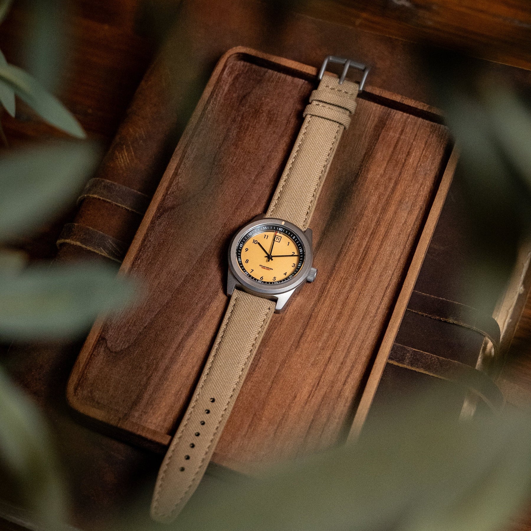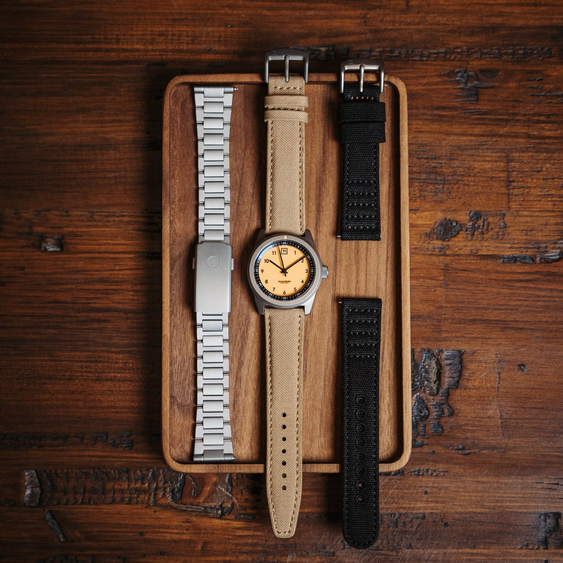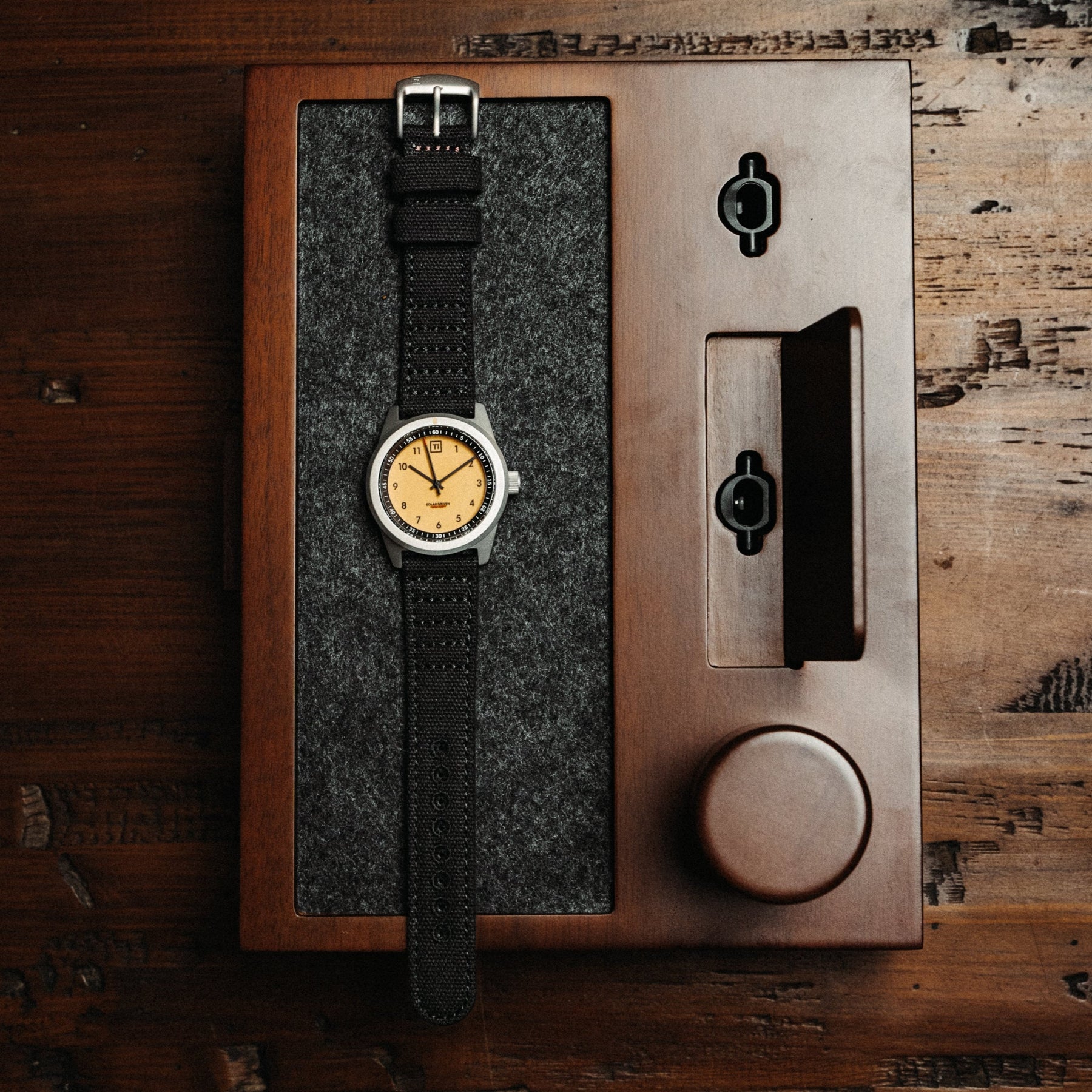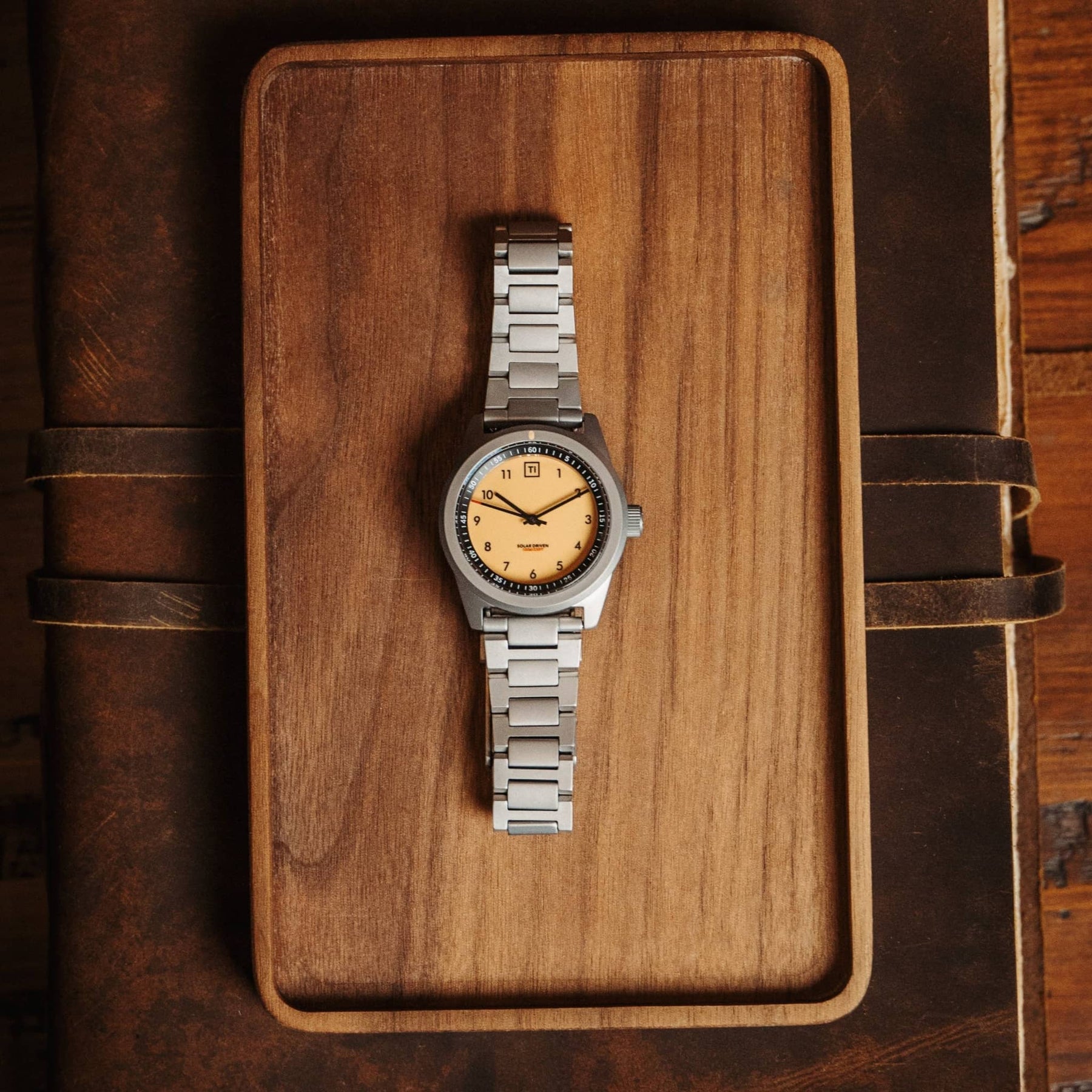 We wanted to introduce a quality timepiece that was at an attainable price point. A simple/clean design that would fit in no matter the situation, but be durable enough to stand up to all your daily tasks. Sapphire crystal covers the Miyota 2070 solar movement. A beveled chapter ring brings dimension to the face. Whether this is your first watch, or your 50th, this would be a great daily companion!