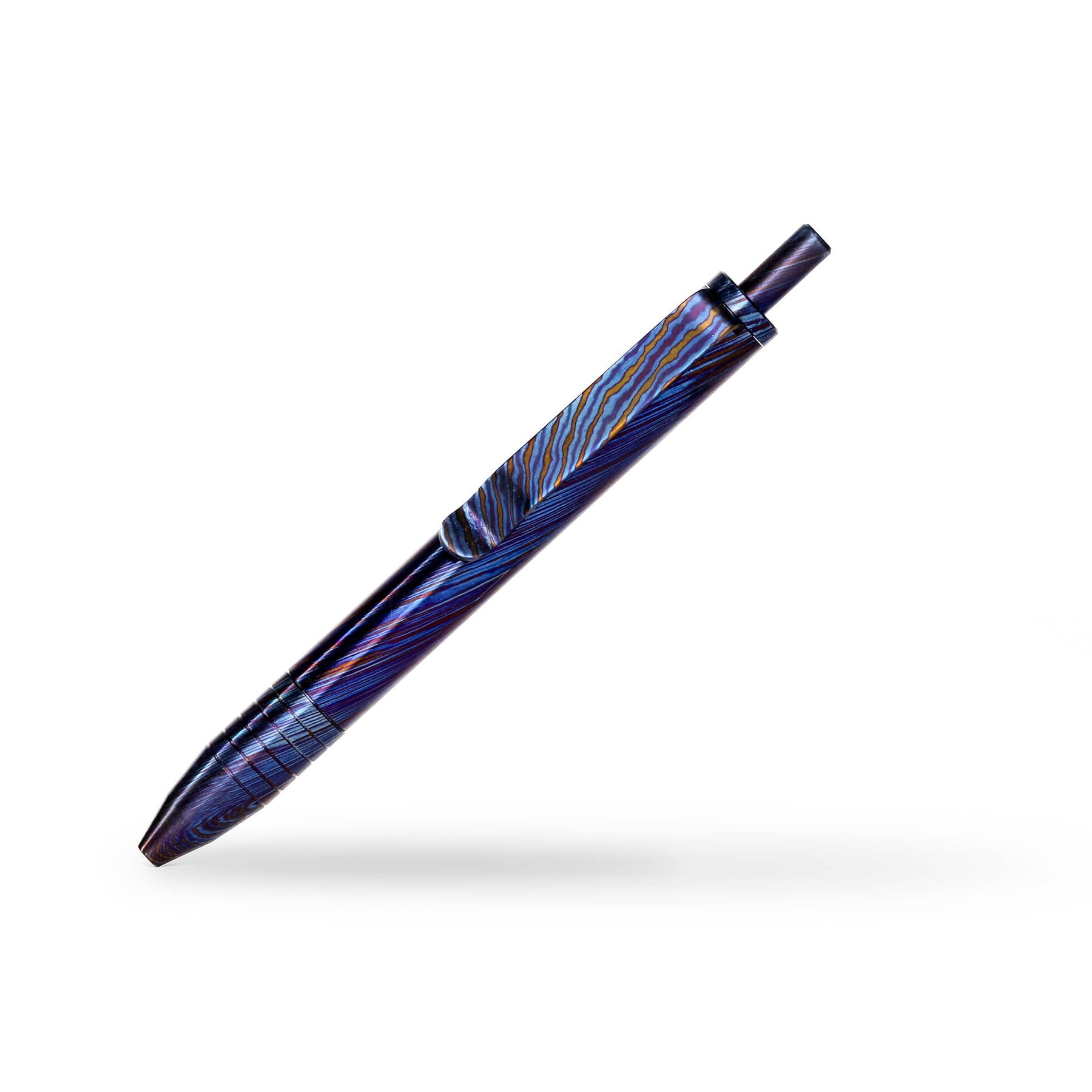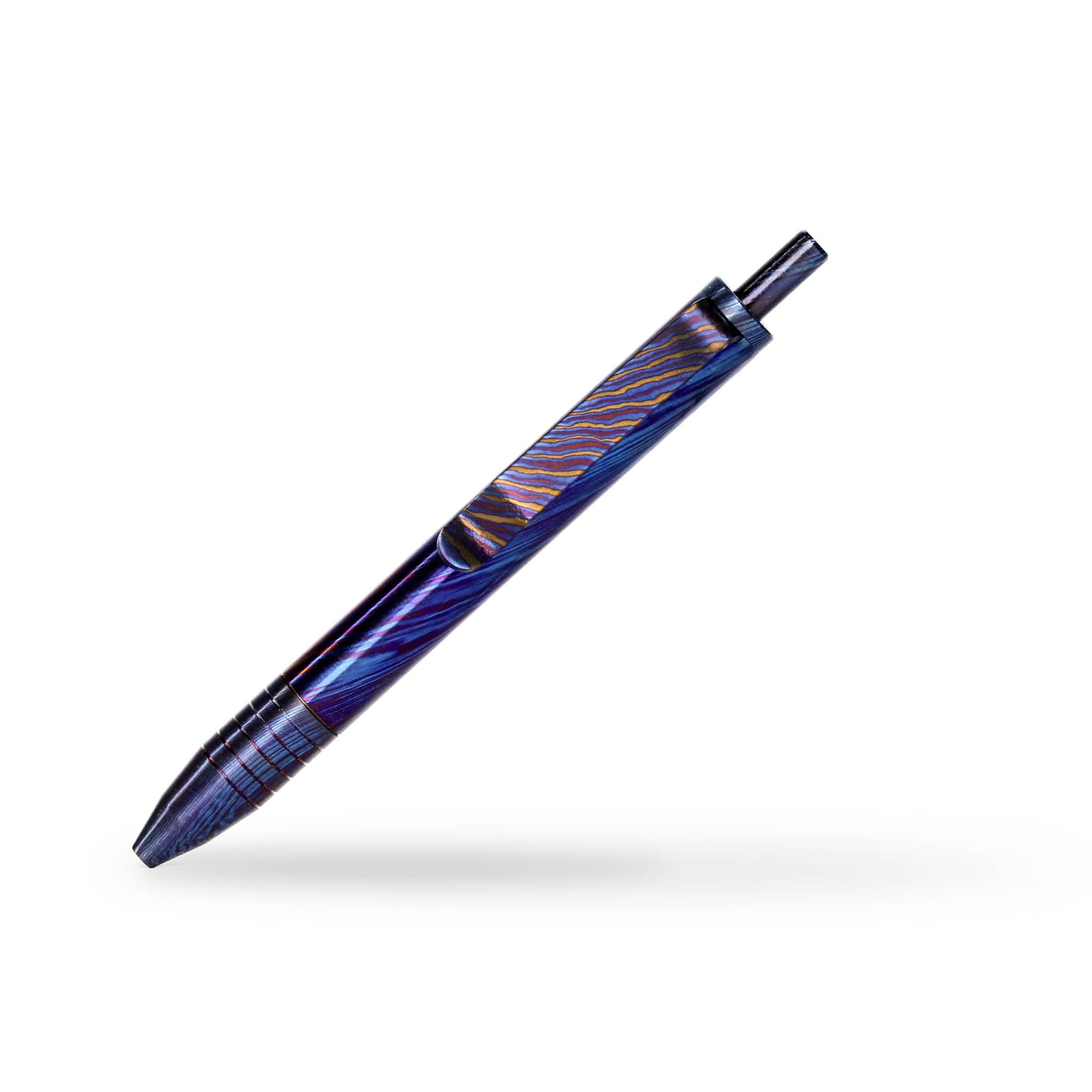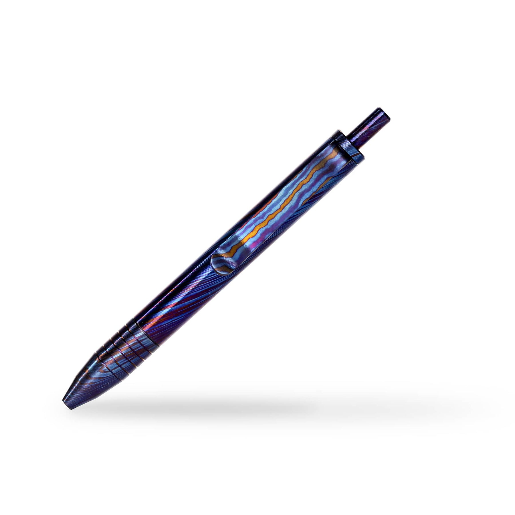 These Mini Clicks are fully machined from Titanium Damascus, each piece has been polished and torched to give unique colors and patterns.