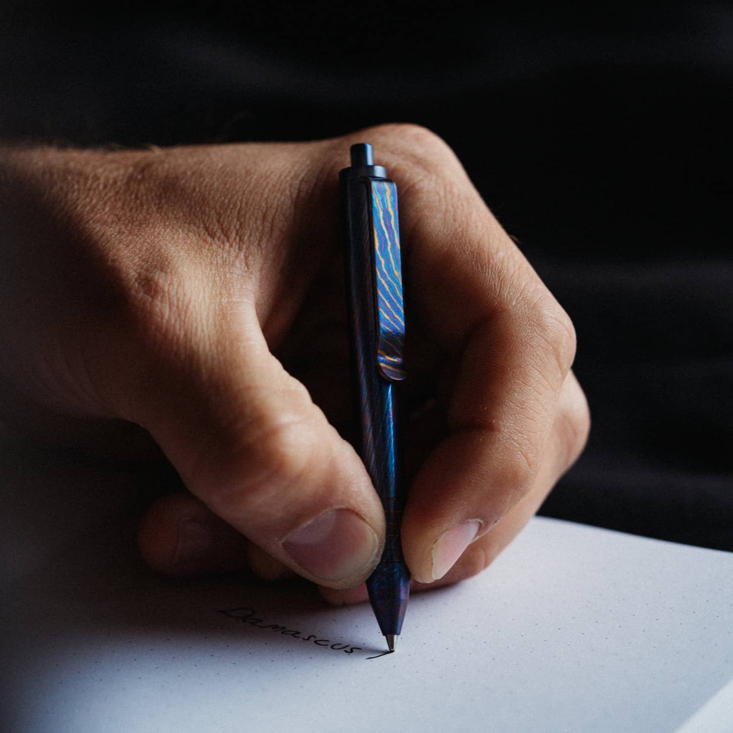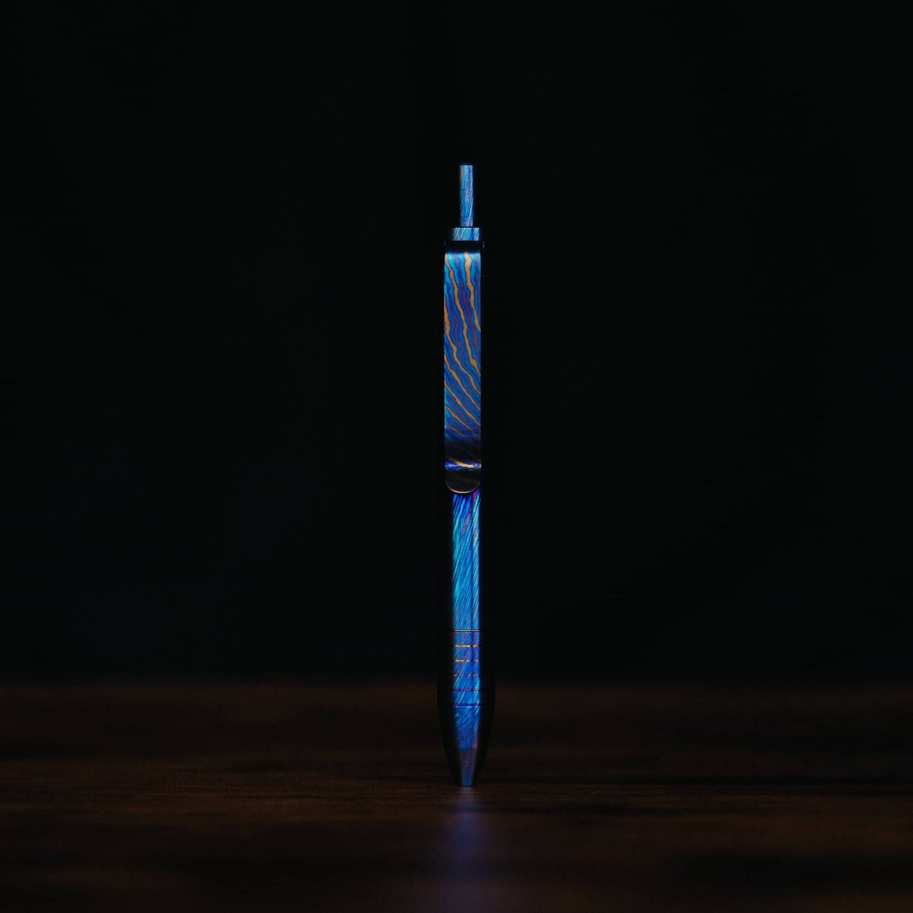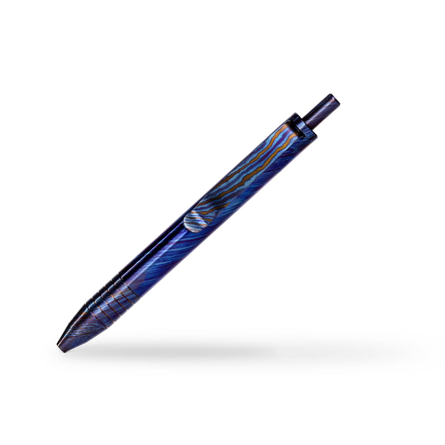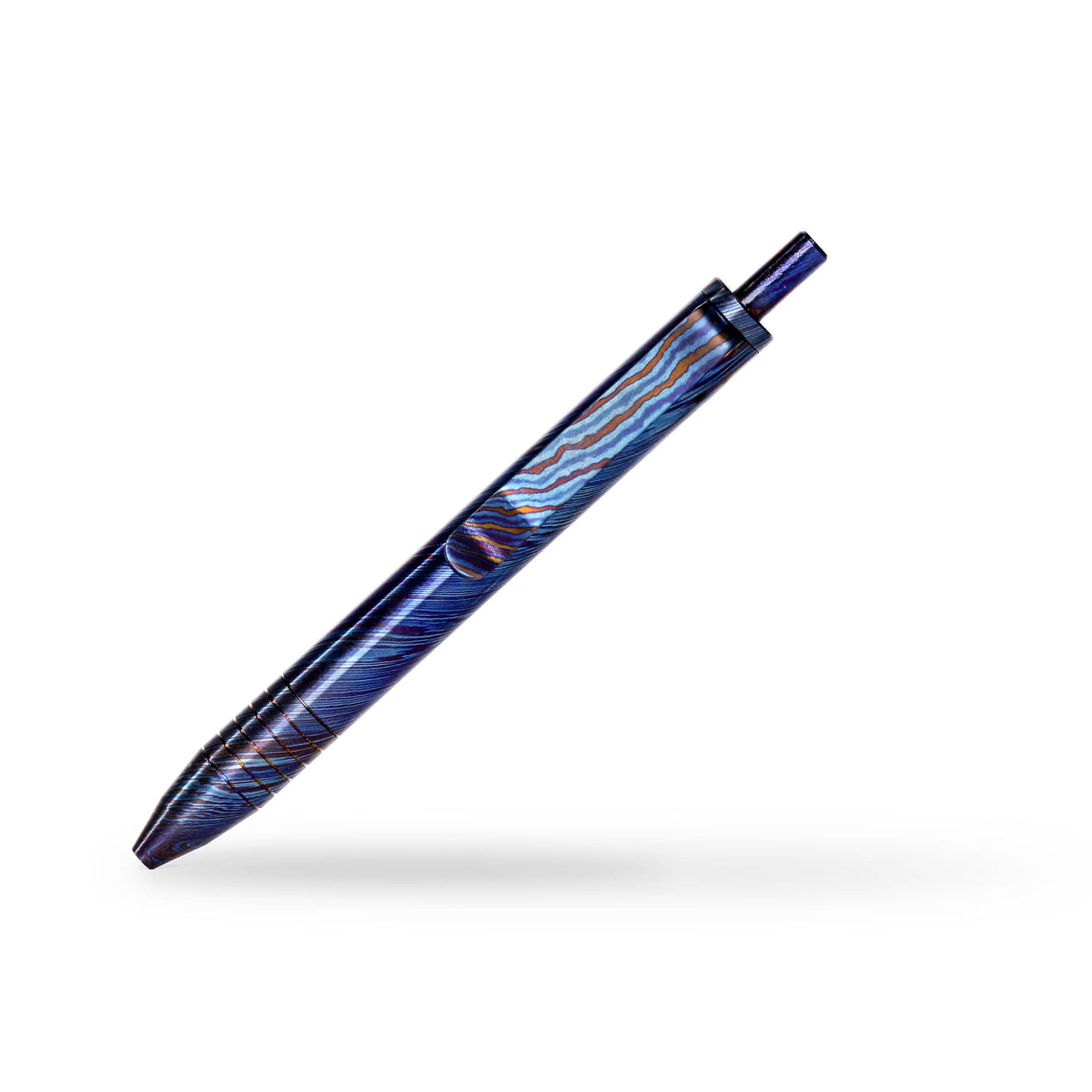 These Mini Clicks are fully machined from Titanium Damascus, each piece has been polished and torched to give unique colors and patterns.