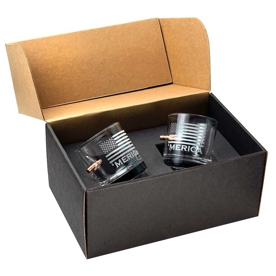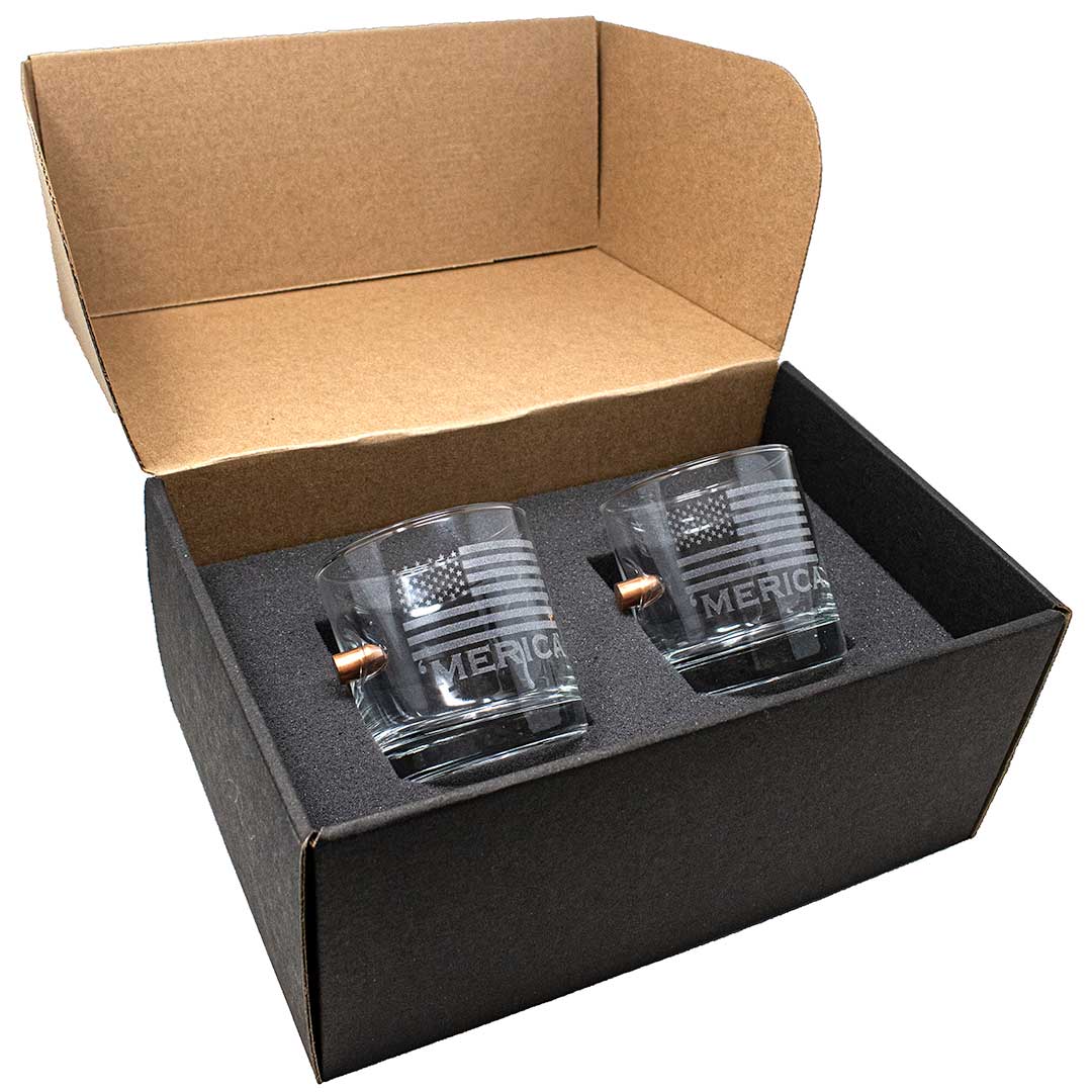 This 11oz whiskey glass is hand-embedded with a real, lead-free 0.308 or 0.45ACP bullet and laser etched with our best selling 'Merica design.